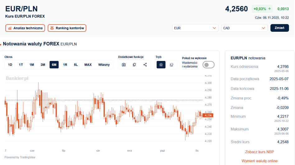 - Jeśli A. Glapiński zasygnalizuje nadchodząca pauzę w obniżkach stóp procentowych, co mogłoby nieco schłodzić oczekiwania dotyczące tempa i skali tych obniżek w przyszłym roku, to przełożyłoby się pozytywnie na notowania złotego - napisali w porannym raporcie analitycy PKO BP.