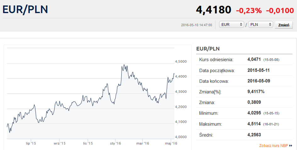 W ciągu ostatniego miesiąca złoty znacząco osłabił się względem euro. Kurs wspólnotowej waluty wzrósł z 4,23 zł do 4,42 zł, czym zdaniem części ekspertów zdyskontował obniżkę ratingu.