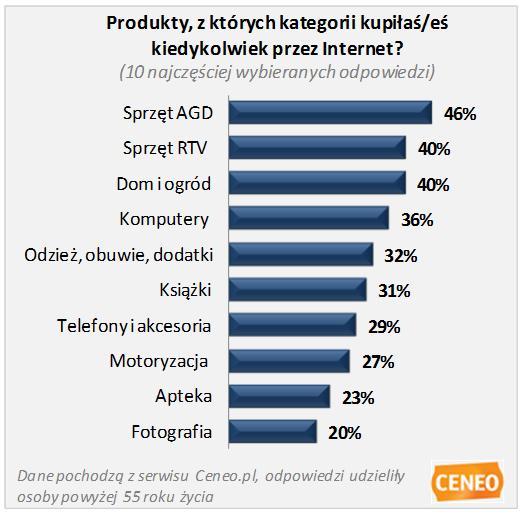 Najstarsi użytkownicy Ceneo.pl zostali zapytani o przedmioty, które kiedykolwiek kupili przez Internet. Seniorzy mieli do wyboru 19 kategorii, najczęściej zaznaczanymi były: Sprzęt AGD, RTV oraz dom i ogród.