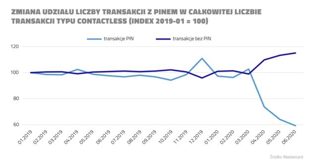 Przytoczone w dokumencie dane organizacji Mastercard pokazują na szybki wzrost znaczenia operacji, w których nie podaje się PIN. Po wprowadzeniu zmian w limitach wartości transakcji (granicę niewymagającą PIN podwyższono do 100 zł) w maju i czerwcu zmienił się obraz rynku. W porównaniu ze styczniem 2019 r. (stanowiącym punkt odniesienia w indeksie Mastercard) odsetek transakcji zbliżeniowych z wykorzystaniem PIN spadł w czerwcu 2020 r. o 41 pp. Indeks transakcji bez PIN wzrósł natomiast o 15 pp.