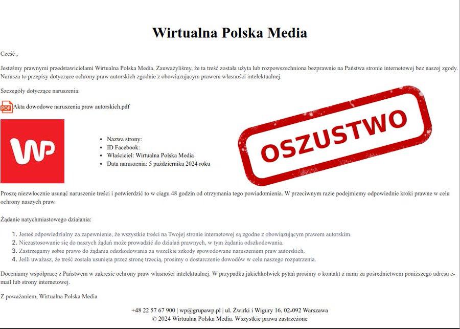 Interesującym przykładem internetowego scamu jest schemat, przed którym ostrzega CERT Polska. Do skrzynek pocztowych trafia wiadomość o rzekomym naruszeniu praw autorskich przez adresata. Treść ma przypominać pismo przygotowane przez prawników jednego z internetowych wydawców. Nadawca wskazuje, że zastrzega sobie prawo do żądania odszkodowania.
