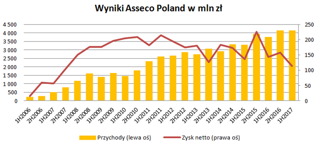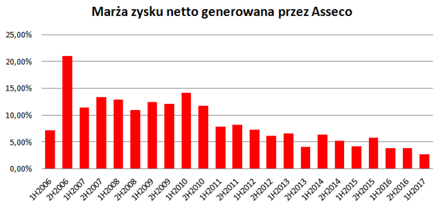 Zacznijmy od tegorocznych osiągnięć dwóch branżowych gigantów. W pierwszym półroczu 2017 roku Asseco Poland, mimo rekordowych przychodów, wypracowało 113,3 mln zł zysku netto przypadającego akcjonariuszom jednostki dominującej. Jest to tym samym najsłabsze półrocze od końcówki 2007 roku, a więc czasów, gdy zaczął się proces łączenia Asseco z Prokomem, który pozwolił rzeszowianom na wspięcie się na szczyt polskiego rynku IT.