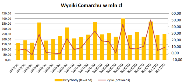 Najgorzej od lat wypadł także Comarch. Zysk netto spółki wyniósł w pierwszym półroczu 13 mln zł, co było najsłabszym wynikiem od pierwszego półrocza 2013 roku. A przecież wyniki spółki jednorazowo wsparły ostatnio pieniądze uzyskane przez Cracovię za sprzedaż Bartosza Kapustki. Comarch zanotował także spadek przychodów - te były najniższe od pierwszego półrocza 2014 roku.