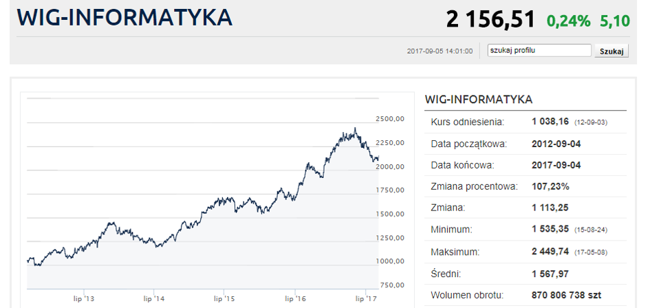 Słabość sektora świetnie obrazuje indeks WIG-Informatyka - najsłabszy spośród branżowych indeksów na GPW. W latach 2015-16 udało mu się uniknąć bessy, jaka panowała na warszawskiej giełdzie, w roku 2017 jako jedyny ma problemy z wyjściem ponad kreskę (obecnie jego stopa zwrotu od początku roku wynosi równe 0 proc.), mimo iż przy Książęcej obserwujemy hossę. Kiedyś spółki informatyczne uznawano za bardzo procykliczne, ostatnie lata sugerują jednak, że zależność jest zgoła odmienna.