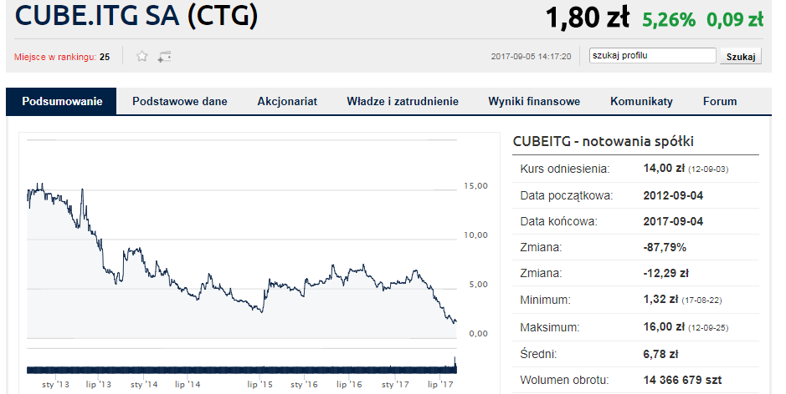 Teoria szybko zmieniła się w praktykę. Kurs Cube zaczął pikować, regulacja zobowiązań stała się wyzwaniem, a w spółce "na szybko" zaczęto poszukiwać gotówki. Zawarto m.in. opiewającą na 7,2 mln zł przedwstępną umowę sprzedaży nieruchomości we Wrocławiu, przeprowadzono też wartą blisko 20 mln zł emisję akcji, 27 września WZA będzie głosowało zaś za udzieleniem pozwolenia na kolejną emisję. W międzyczasie opóźniono publikację raportu śródrocznego, w związku z czym ciężko jest ocenić obecną sytuację finansową spółki. W ostatnim raporcie (za I kw. 2017) Cube pokazał stratę netto oraz przewagę zobowiązań krótkoterminowych (147 mln zł) nad aktywami obrotowymi (89 mln zł).