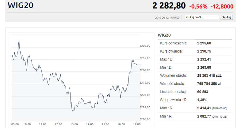 Na środowej sesji WIG20 spadł o 0,6 proc. do 2.282,80 pkt., choć w trakcie dnia momentami tracił blisko 1,5 proc. WIG zniżkował 0,5 proc., mWIG40 poszedł w dół o 0,6 proc., a sWIG80 jako jedyny zyskał, lecz ledwie 0,04 proc. Obroty na GPW wyniosły 867 mln zł, z czego 770 mln zł przypadło na spółki z WIG20.