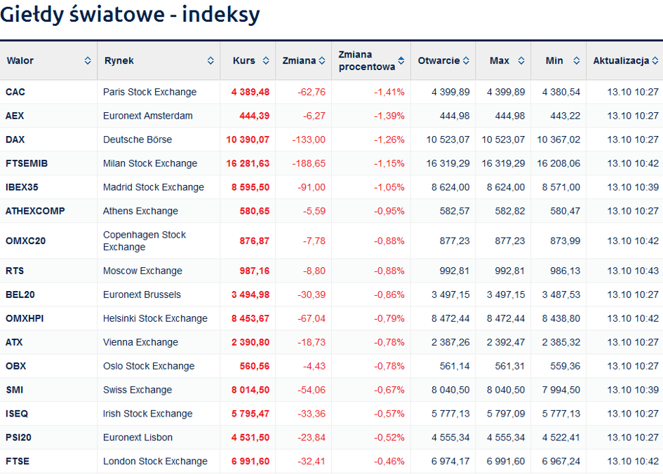 Po blisko 90 minutach handlu na niewielkim plusie były tylko indeksy w Sofii i Kijowie. Na wszystkich pozostałych giełdach Starego Kontynentu przeważały spadki. Najwięcej traciły amsterdamski AEX (-1,4%), paryski CAC40 (-1,3%) i mediolański FTSE MIB (-1,2%).