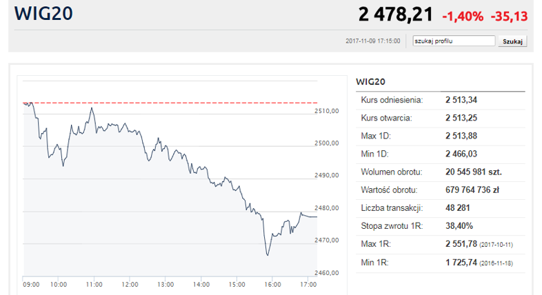 Na tym tle nie wyróżniał się także i polski indeks blue chipów. W zasadzie przez cały dzień WIG20 znajdował się pod kreską, z kolejnymi godzinami pogłębiał jednak spadki. Ostatecznie dzień zamknął stratą 1,4 proc., "dzięki" czemu znów znalazł się poniżej poziomu 2500 punktów.