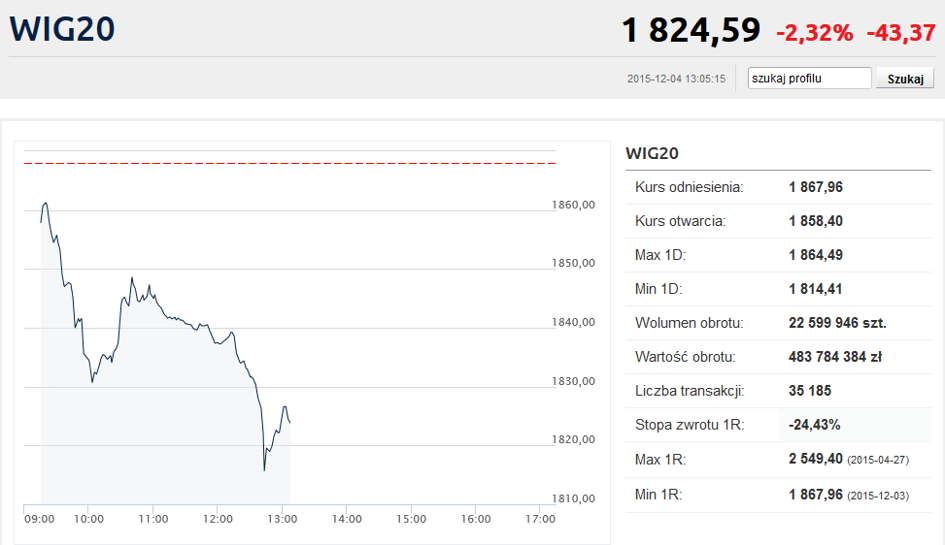 O 13:05 WIG20 spadał już o 2,37%, schodząc do 1823,72 pkt. Kilka minut wcześniej indeks 20 największych spółek wyznaczył świeże 6-letnie minimum na poziomie 1814,41 pkt.