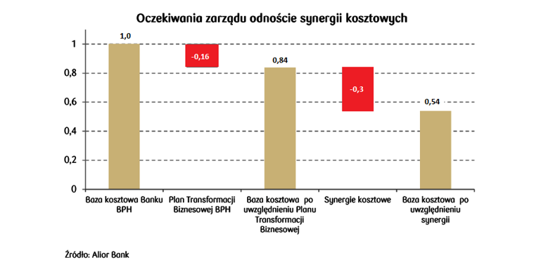 Dla opłacalności całej transakcji równie ważne mogą być synergie. Zarząd Aliora szacuje, że docelowe efekty synergii z przejęcia Banku BPH wyniosą ok. 0,3 mld zł. Według prezentacji inwestorskiej, ok. 25% z tej kwoty ma być widoczne już w 2017, 80% w 2018, a całość ma zostać osiągnięta w 2019 roku. Dodatkowe oszczędności mają zostać osiągnięte z wdrożonego w Banku BPH, przed przejęciem, planu transformacji biznesowej (ok. 160 mln zł). Obecna baza kosztowa w BPH wynosi 1 mld zł.