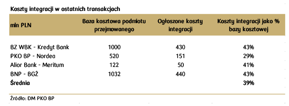 Synergie wymagają jednak poniesienia kosztów, w tym wypadku tych dotyczących integracji. W scenariuszu bazowym mogą wynieść ok. 650 mln PLN, natomiast w najbardziej konserwatywnym scenariuszu mogą sięgnąć nawet 950 mln PLN. Według analityków DM PKO BP sięgną one 750 mln zł. To dużo.