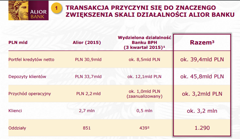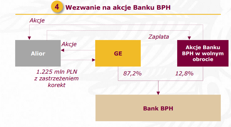 Pierwsze plotki o przejęciu banku BPH pojawiły się już na początku marca. Miesiąc później Alior miał już podpisaną umowę nabycia podstawowej działalności banku od GE, głównego akcjonariusza BPH (87,23% udziałów), który zapowiedział wycofywanie się z sektora bankowego. Transakcja nie obejmuje zakupu portfela wszystkich kredytów hipotecznych (we frankach, innych walutach obcych i polskich złotych) oraz BPH TFI. Cenę ustalono na ponad 1,2 mld zł.