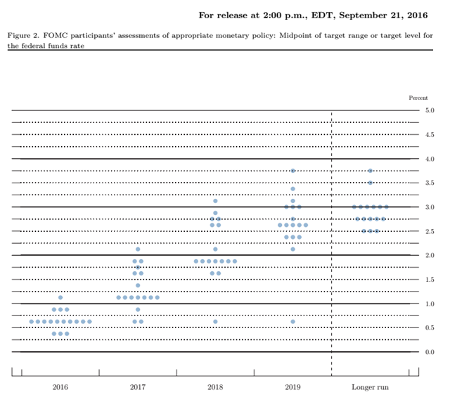 Problem w tym, że przedstawiciele FOMC już wielokrotnie zapowiadali podwyżki stóp, które jednak nigdy nie dochodziły do skutku. Za to z roku na rok fedokropki pokazują coraz niższy „pożądany” poziom stopy funduszy federalnych w „dłuższym terminie”. Jeszcze rok temu większość decydentów chciałaby docelowo podnieść stopy do 3,25-3,50%, ale najwcześniej w roku 2019. We wrześniu projekcja ta została obniżona do 2,75-3,00%, i to po roku 2019.