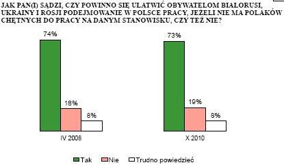 Ankietowani zostali także zapytani o ich stosunek do ułatwienia zatrudnienia pracowników ze Wschodu. 47 proc. Polaków nie potrafiło się do tej kwestii ustosunkować, a 37 proc. uważa to za niekorzystne. Najmniej przychylni są robotnicy niewykwalifikowani, bezrobotni, a także osoby najmniej zarabiające, mające złą sytuację materialną. Oni są najbardziej narażeni na to, że tańszy pracownik ze Wschodu wyprze ich w rynku.