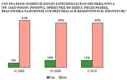 Tylko 3 proc. Polaków zadeklarowało, że skorzystało z płatnej pomocy obcokrajowca np. przy pracach domowych, remontowych, opiece nad dziećmi, lub zatrudniali obywatela innego kraju na budowie czy przy pracach polowych. Z kolei 14 proc. badanych zna kogoś, kto zatrudnia obcokrajowca – takie zatrudnienie zyskuje na popularności.