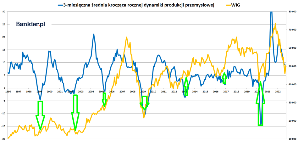Czasu na zakupy nie sygnalizuje też dynamika produkcji przemysłowej, która wciąż utrzymuje się na poziomach zbliżonych do 10% rdr. To stanowczo za wysoki poziom jak na dołek bessy. W przeszłości 100-procentową skuteczność „trafienia” dołka na GPW dawała dopiero sytuacja, gdy trzymiesięczna średnia krocząca rocznej dynamiki produkcji przemysłowej spadała poniżej zera i wyznaczała cykliczne minimum. Z tą sytuacją nie mamy obecnie do czynienia.