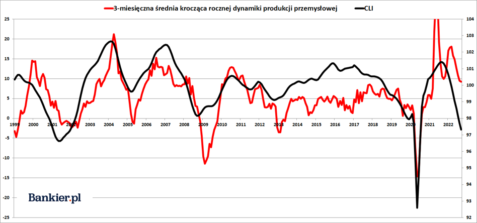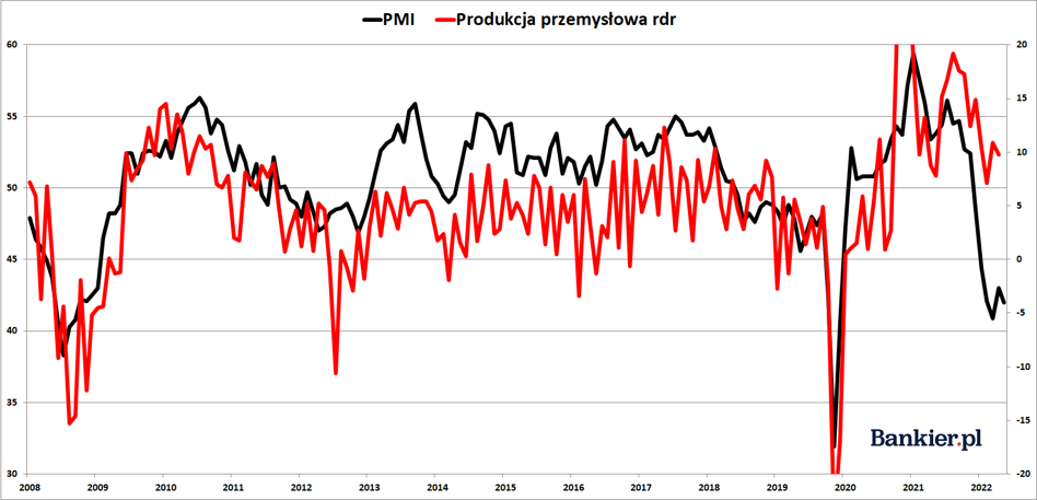 Ale niedługo mieć możemy. Jeśli wskaźnik PMI dla polskiego sektora wytwórczego nie odłączył się od statystyk gusowskiej produkcji przemysłowej, to w nadchodzących miesiącach powinniśmy zobaczyć ostre wyhamowanie dynamiki produkcji przemysłowej. Sprzyjać temu będzie nie tylko wysoka baza z ostatniej zimy i wiosny, ale też sygnalizowany przez menedżerów logistyki silny spadek zamówień. Trudno się bowiem spodziewać, aby zubożony przez galopująca inflację europejski konsument nadal kupował tyle wyrobów przemysłowych co podczas covidowych lockdownów, gdy bez problemu można było kupić nowy telewizor, ale wyjść do kina czy restauracji to już nie za bardzo było wolno.