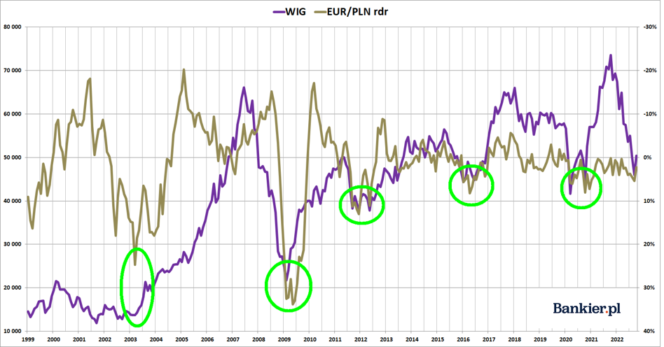 Ostatnim z uniwersalnych sygnałów kupna na GPW była słabość złotego. Polska waluta od marca 2020 roku radzi sobie po prostu fatalnie, notując w zasadzie bezustanną deprecjację względem euro. Proszę zwrócić uwagę na fakt, że roczna dynamika kursu EUR/PLN (na interwale miesięcznym) pozostaje ujemna od początku ery covidowych lockdownów. Równocześnie wyprzedaż złotego nie przybiera tak dramatycznej formy, jak to zdarzało się w latach 2000-10. W tamtym okresie przytrafiały się skoki notowań euro o 10%, 20% lub nawet 30% w skali rocznej. W poprzedniej dekadzie do wygenerowania sygnału kupna wystarczyła mniej więcej 10-procentowa deprecjacja polskiej waluty.