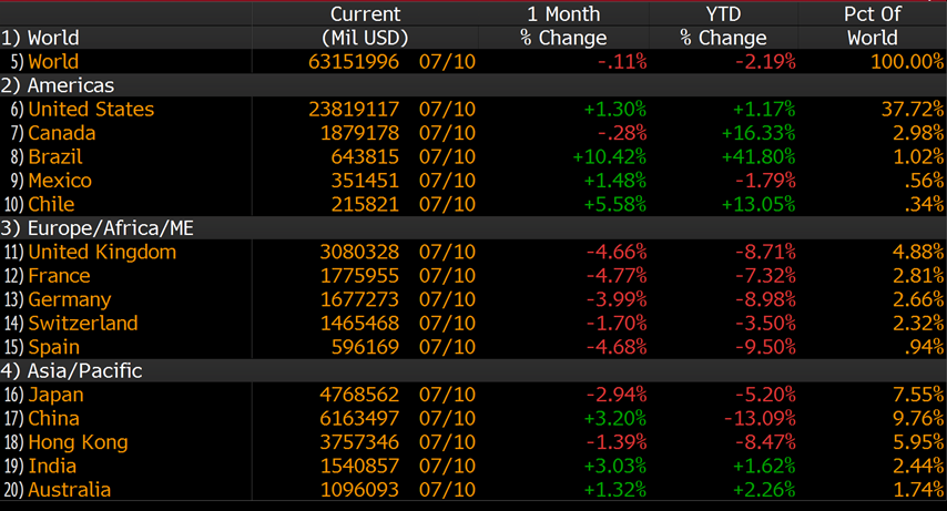 Indeks 30 największych niemieckich spółek w dalszym ciągu porusza się w kanale spadkowym, lecz są szanse na jego wybicie. Nie jest to spowodowane lepszymi nastrojami w Europie, ani super zyskami firm, lecz z nowymi szczytami na indeksie S&P 500. Giełda amerykańska wyznacza trendy na światowych rynkach, dlatego że jej kapitalizacja jest największa na świecie, przedstawia to tabela zamieszona poniżej.