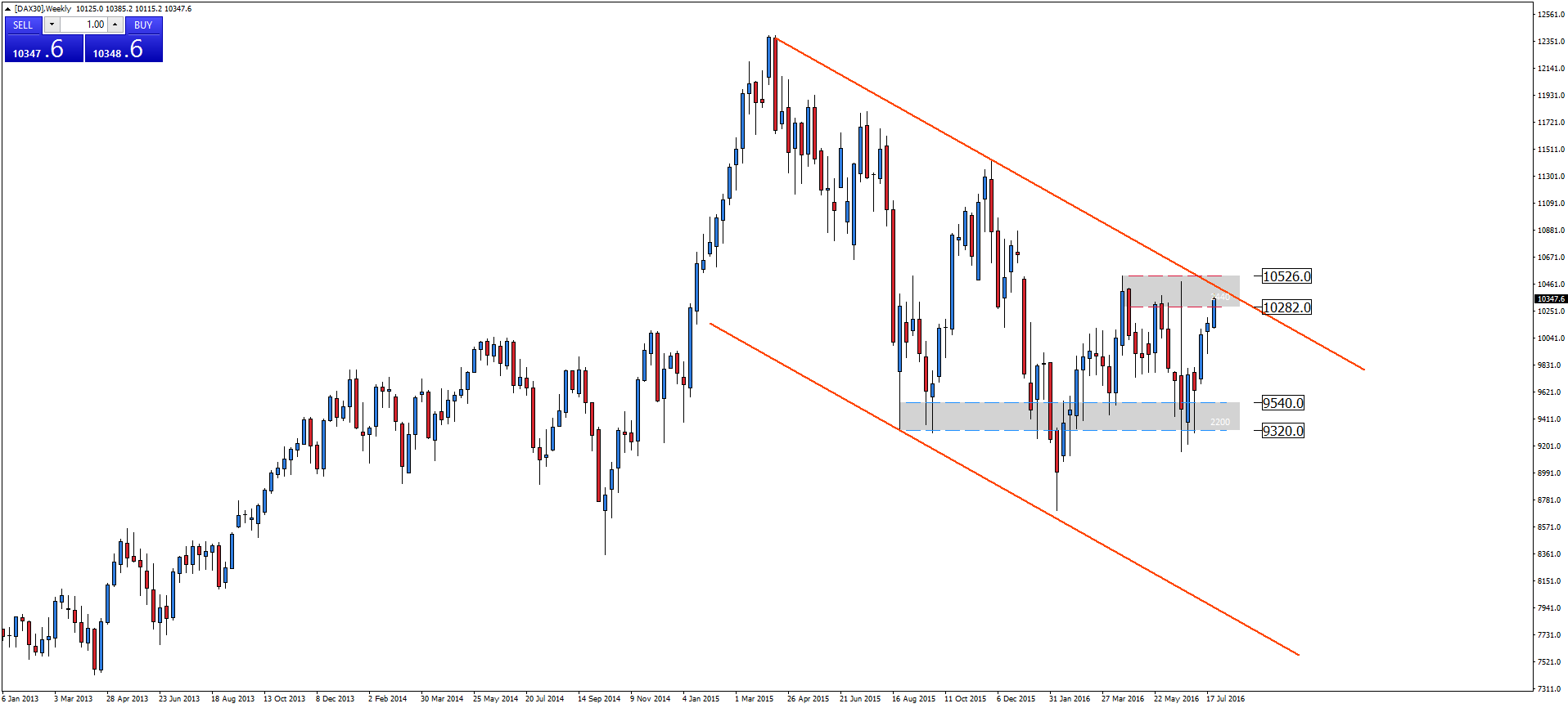 Indeks DAX 30 na interwale tygodniowym w dalszym ciągu porusza się w kanale spadkowym. Jako jeden z nielicznych indeksów nie zdołał odrobić strat związanych z wynikiem referendum w Wielkiej Brytanii. Jednak kontynuacja dalszego luzowania polityki monetarnej zachęca kupujących do wypchnięcia indeksu na jeszcze wyższe poziomy.