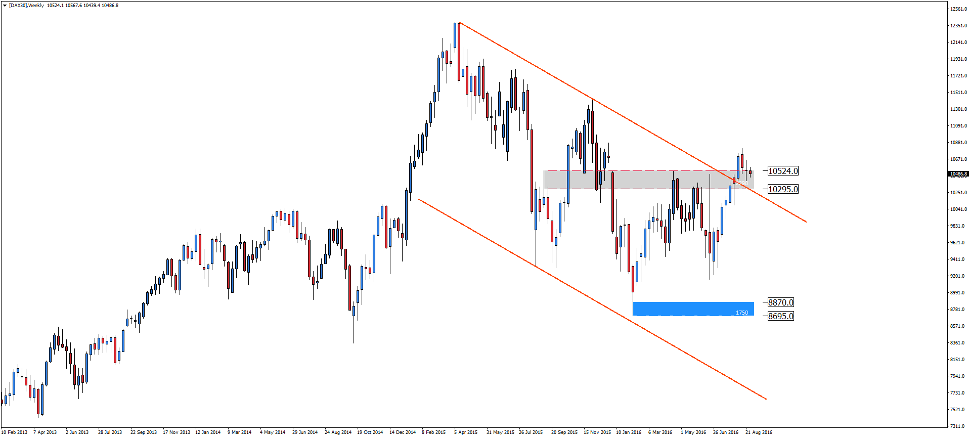 Trzy tygodnie temu kupujący na indeksie DAX 30 zmienili długoterminową sytuację na wykresie. Po pokonaniu górnego ograniczenia kanału spadkowego stronie popytowej udało się przerwać trend spadkowy. Ponadto został również pokonany bardzo silny opór w okolicy 10295-10524 punktów.