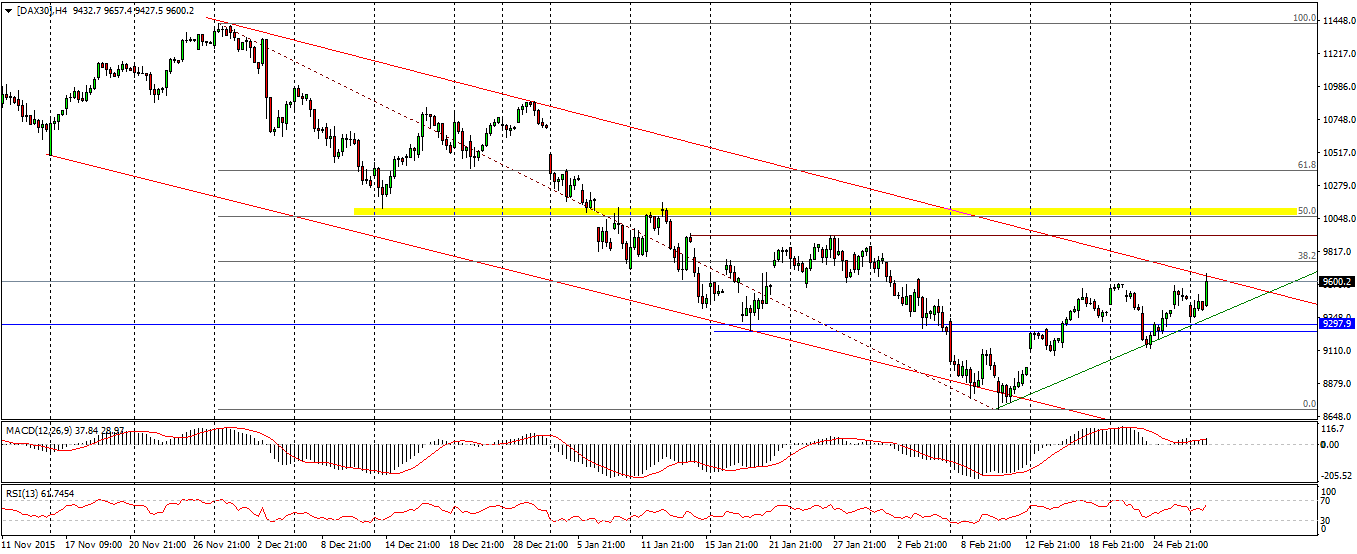 Wykres H4 kontraktu na niemieckiego DAX-a atakuje górne ograniczenie 3,5-miesięcznego kanału spadkowego (9626), przy okazji próbując się przebić przez lokalne maksima z 22 lutego. Jeżeli to się uda to należy spodziewać się nie tylko skutecznego ataku na 38,2% zniesienie Fibo, ale również ruchu do minimum 10058-10121 pkt., gdzie kolejną silną strefę oporu tworzy m.in. 50% zniesienie Fibo.