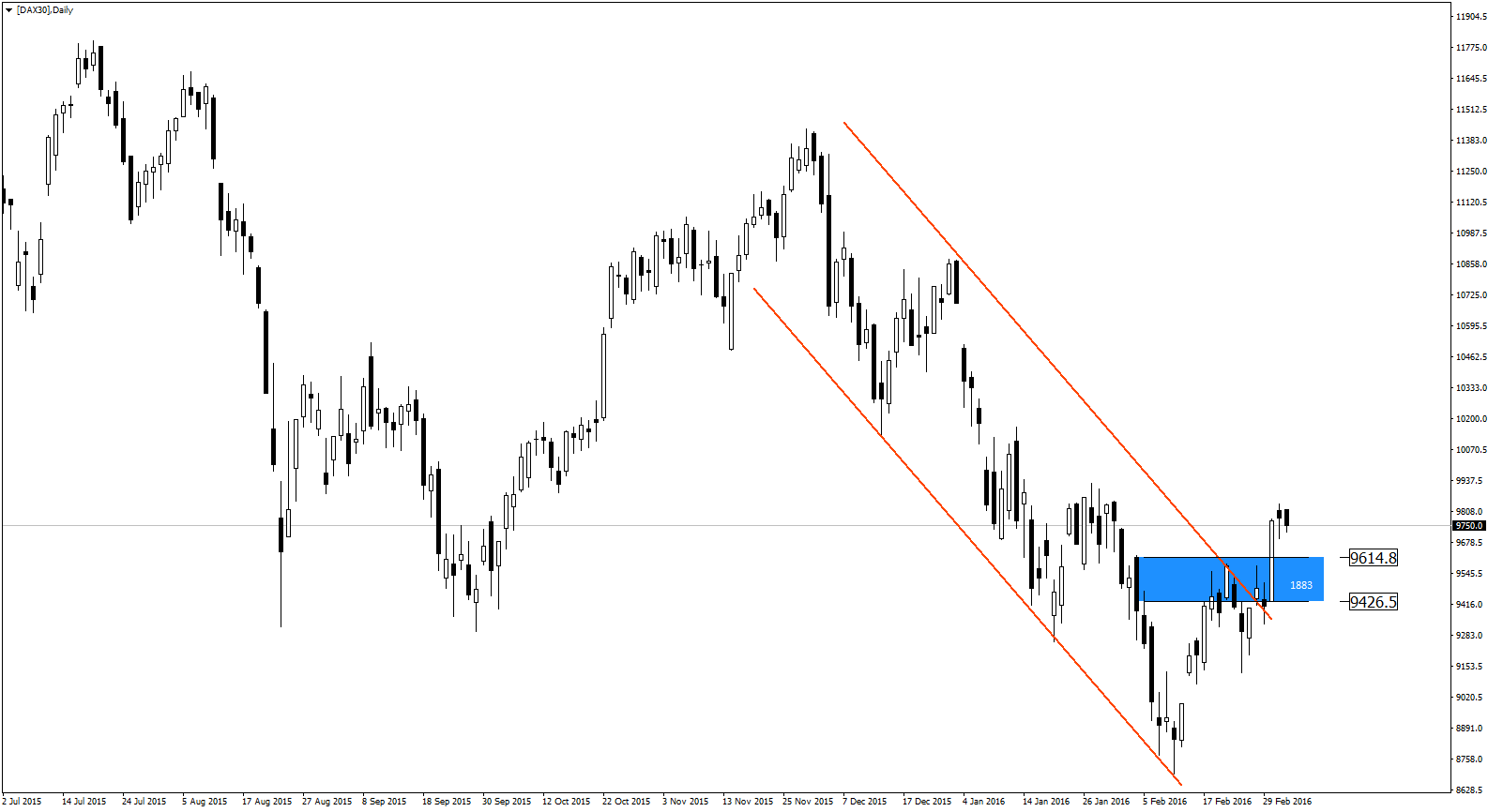 Indeks 30 największych spółek niemieckich na interwale dziennym zdołał pokonać górne ograniczenie kanału spadkowego oraz z impetem przebił się przez opór 9425-9615. Po wybiciu się z kanału spadkowego DAX 30 powinien kontynuować ruch wzrostowy.