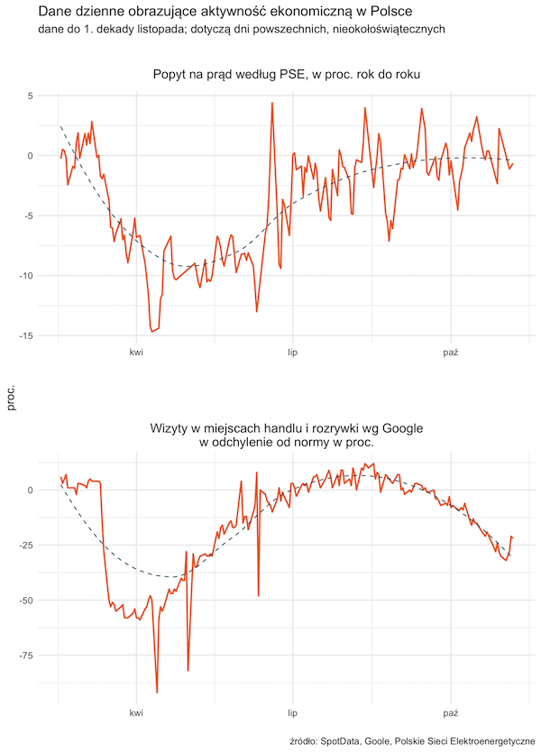My śledzimy takie wskaźniki i tutaj przedstawiam ich przykładowe wyniki. Pokazują one, że lockdown już dotyka gospodarkę, ale na razie jest to proces łagodniejszy niż wiosną.