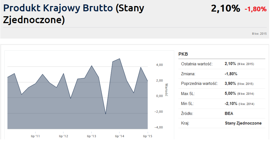 Rezultatem niższych wydatków konsumpcyjnych może być słabszy wzrost produktu krajowego brutto Stanów Zjednoczonych. Model Fed z Atlanty wskazuje, że w czwartym kwartale annualizowana dynamika amerykańskiego PKB wyniesie tylko 1,8%. Po rewizji w trzecim kwartale największa gospodarka świata rozwijała się w tempie 2,1% wobec 3,9% w Q2 i 0,6% w pierwszych trzech miesiącach 2015 roku. Uśredniając dałoby to roczny realny wzrost PKB Stanów Zjednoczonych o 2,1%, co byłoby najniższym wynikiem od 2011 roku.