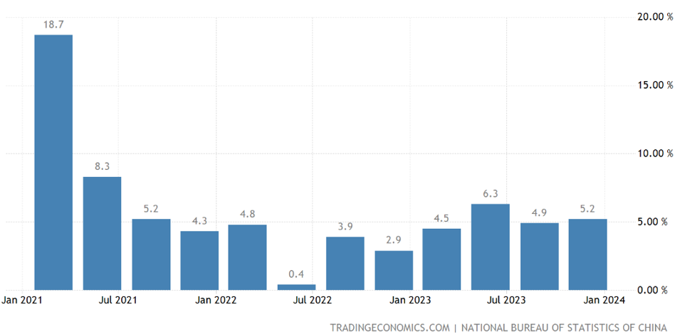 Pekin spodziewał się 5%, a ekonomiści ankietowani przez agencję Reutera prognozowali 5,3%, tymczasem PKB Chin w 2023 roku wzrósł o 5,2%. Według oficjalnych statystyk tempo wzrostu gospodarczego Państwa Środka osiągnęło identyczny wynik 5,2% w IV kwartale 2023 roku w porównaniu z 4,9% odnotowanymi w okresie od lipca do września.