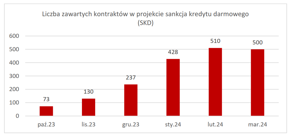 „Skuteczne podniesienie zarzutów naruszenia przepisów ustawy o kredycie konsumenckim i skorzystanie przez konsumenta z sankcji kredytu darmowego nie oznacza nieważności umowy o kredyt konsumencki, umowa pozostaje w obrocie prawnym, ale Bank traci przychody z odsetek. Na dzień 31 marca 2024 roku przed sądami zawisło łącznie 19 spraw dot. sankcji kredytu darmowego, w których wartość przedmiotu sporu wynosi: 462,8 tys. zł” – wskazano w dokumencie.