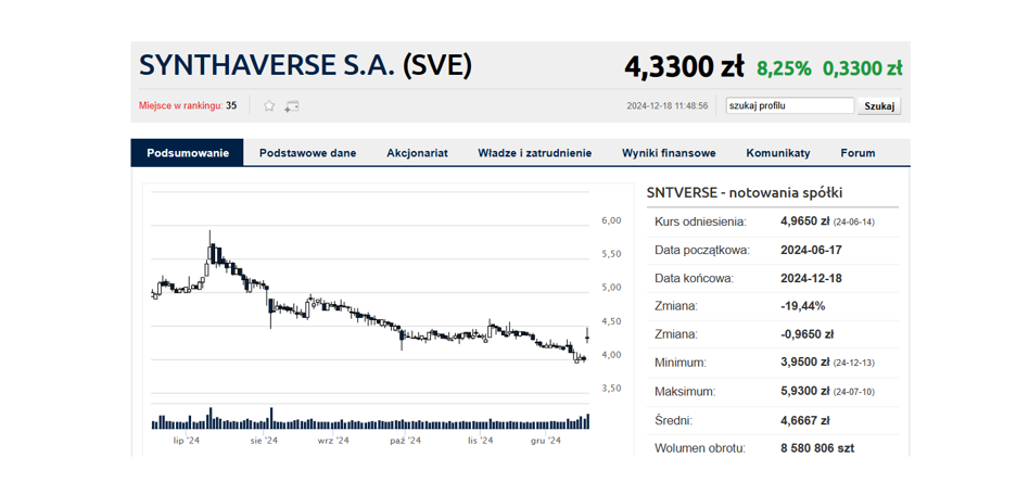 W reakcji na nowe wiadomości kurs Synthaverse na warszawskiej giełdzie drożał do 4,47 zł za akcję, czyli o 11,75 proc. zaraz po otwarciu notowań. Po kilku godzinach handlu wzrosty utrzymywały się na poziomie około 8 proc. Kurs odbił z najniższych poziomów od kwietnia bieżącego roku. Na koniec dnia kurs zyskał 7 proc.