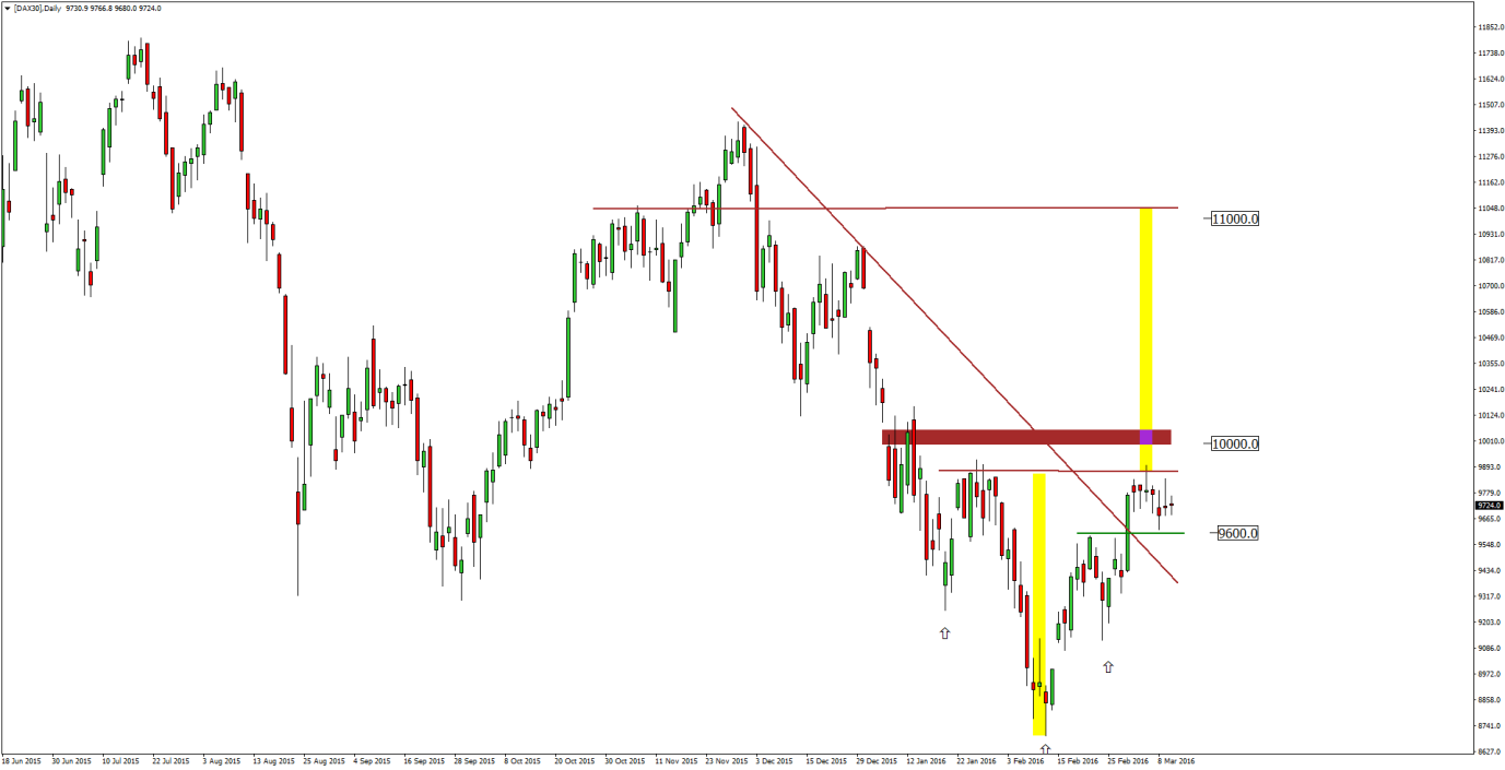 Na wykresie dziennym indeksu DAX 30 widać przełamaną w miniony wtorek linię trendu spadkowego. Ponadto można zaobserwować tworząca się formację oRGR., której zasięg to nawet poziom 11000 pkt., a linia szyi wypada w okolicach 9900 pkt. Jednak przełamanie silnego oporu w pobliżu okrągłego poziomu 10000 pkt. będzie dopiero silnym sygnałem wzrostowym. Z kolei przebicie wsparcia w okolicach 9600 pkt. zaneguje ruch w górę, przynajmniej w krótkim terminie.
