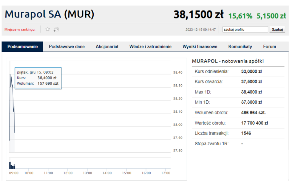 Kurs akcji Murapolu na otwarciu w pierwszym dniu notowań na GPW wzrósł o 13,6 proc. do 37,5 zł. To pierwszy debiut na GPW od grudnia 2021 r., który nie był poprzedzony notowaniami akcji na rynku NewConnect. Oferta publiczna przed wejściem na giełdę miała wartość ponad 400 mln zł.