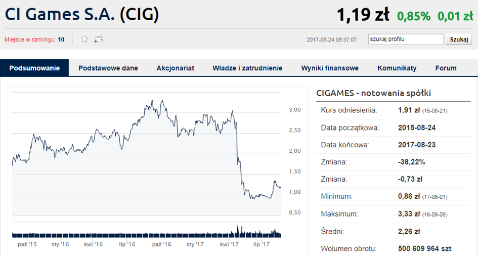 Bardziej niepokojący jest za to stosunek ceny do wartości księgowej. Jest to obecnie niemal 80 pkt, co wyraźnie odbiega od innych spółek. Mało tego, żaden z producentów gier uwzględnionych w zestawieniu nawet nie zbliżył się do podobnego wyniku, a średnia dla branży wynosi poniżej 10 pkt.
