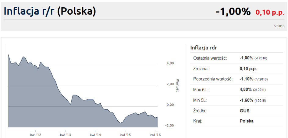 Według danych GUS deflacja cenowa nad Wisłą utrzymuje się już od lipca 2014. Największy do tej pory spadek cen (-1,6%) odnotowano w lutym 2015 r.