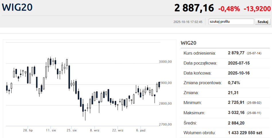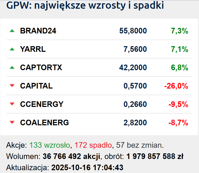 Po drugiej stronie rynku znalazły się notowania Pepco, które zyskały 3,60%. Akcjom spółki mogły przysłużyć się informacje z 15 października. Jak podano w komunikacie Pepco zamknie 28 sklepów na terenie Niemiec do końca stycznia 2026 roku, co pozwoli odciąć nierentowną gałąź biznesu.