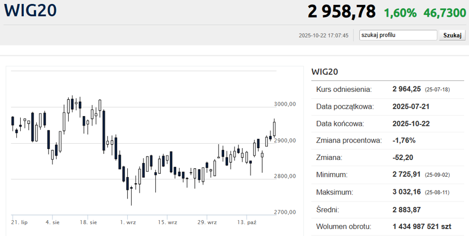 W środę 22 października indeksy polskiej giełdy wyróżniała się nie tylko na tle europejskich parkietów, ale także reszty świata. Gdy na GPW kończył się handel, niemiecki DAX tracił 0,52%, francuski CAC40 cofał się o 0,54%. S&P500 i Nasdaq spadały w tym czasie odpowiednio o 0,25% i 0,57%.