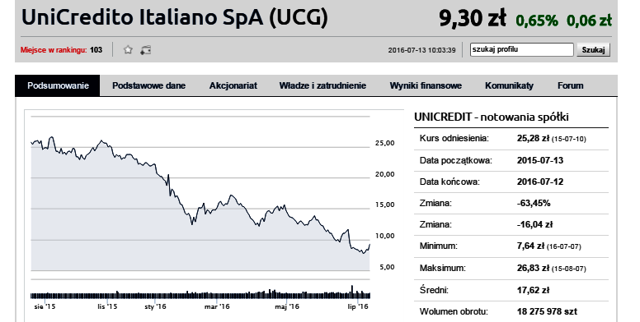 W nie najlepszej formie jest także włoski gigant – UniCredit. W maju stanowisko stracił prezes spółki. Powodów zwolnienia nie podano, jednak inwestorzy już od kilku miesięcy narzekali na sytuację spółki. Trudne warunki gospodarcze utrudniały akcję kredytową. Jednocześnie w aktywach banku znajduje się 80 mld euro złych kredytów, a jego zabezpieczenia są zbyt słabe.