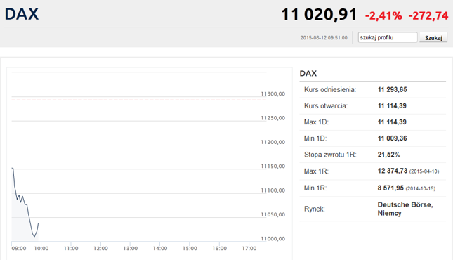 Po godzinie handlu DAX zniżkował o 2,1% po tym, jak we wtorek spadł o 2,7%. W Paryżu CAC40 tracił 2,3%, w Mediolanie FTSE MIB spadał o 1,9%, a madrycki IBEX35 o 1,65%. Na giełdzie we Frankfurcie najmocniej taniały akcje koncernów motoryzacyjnych, dla których Chiny w ostatnich latach stały się najważniejszym rynkiem zbytu. Notowania BMW zniżkowały o 3,8%, Daimlera o 4,15%, a VW o 2,5%.