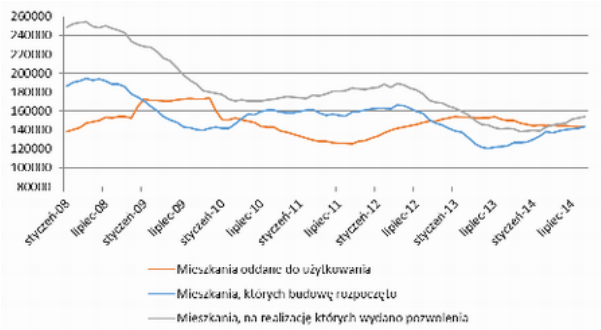58,7 tys. pozwoleń na budowę zostało wydanych od początku tego roku deweloperom. To o 41,7 proc. więcej niż w analogicznym okresie 2013 r. Równie imponująco prezentuje się statystyka liczby rozpoczętych budów. W w/w okresie firmy budujące mieszkania na sprzedaż rozpoczęły budowę 50,8 tys. lokali, co jest wartością o 39,5 proc. wyższą od ubiegłego roku. Wzrost, choć znacząco mniejszy, GUS odnotował także jeśli chodzi o mieszkania oddane do użytkowania. Przez dziewięć miesięcy tego roku deweloperzy oddali 39,1 tys. lokali, czyli więcej o 4,1 proc.