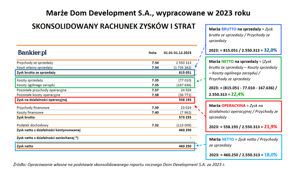 Sprawdźmy zatem, jak marże wyglądały u tego jednego z największych deweloperów w Polsce w 2023 r., wyjaśniając po krótce, jak się je oblicza. W tym celu pomocą służy prof. Jacek Welc, który wziął na warsztat właśnie raport roczny Dom Development za ubiegły rok i w obrazowy sposób przedstawił wielopoziomowy aspekt marż deweloperów.