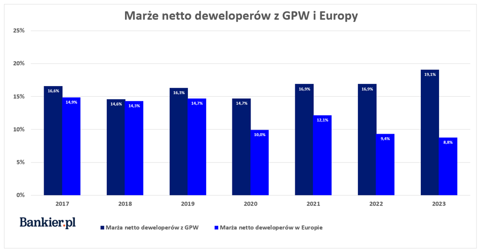 Dla okresu ostatnich 5 lat (2019-2023) średnia marża brutto polskich deweloperów z GPW wyniosła 29,5%, a w przypadku Europy było to 23,9%. W przypadku marży netto było to 16,8% dla przykładu z Polski oraz 11% dla Europy. Widać wyraźnie, że marże w Polsce są wyraźnie wyższe niż w średnia w całej Europie, przynajmniej wg żródła danych, jakim jest baza prof. Damodarana.