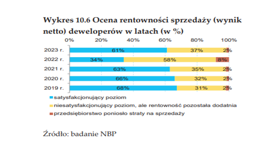 Inaczej mogło być w przypadku bardzo licznej grupy mniejszych firm (spoza GPW), o czym świadczyć mogą wyniki badania przeprowadzonego przez NBP, które znalazły się w opracowaniu „Raport o sytuacji na rynku nieruchomości 2023”. Według danych wzrost rentowności sprzedaży w 2023 r. zadeklarowało 40% ankietowanych firm, 32% utrzymało ją na poziomie z 2022 r., 16% odnotowało nieznaczny spadek, a 12% znaczną korektę, przy czym najwięcej takich ocen odnotowano wśród dużych podmiotów (20%). Wynik za 2023 r. dla 61% ankietowanych był satysfakcjonujący, a 37% nie, z tym że przy dodatnim poziomie rentowności. Tylko 2% poniosło stratę, powracając do średniej sprzed gorszego 2022 r.