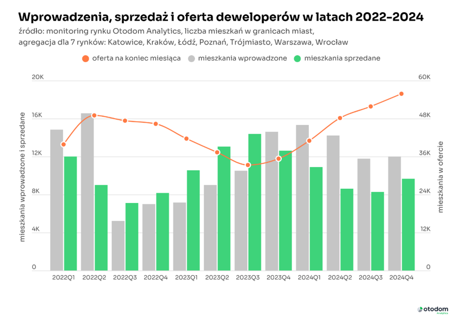 W IV kw. 2024 r., deweloperzy działający na wspomnianych rynkach wprowadzili do oferty ok. 12 tys. mieszkań, a sprzedali niespełna 10 tys. Sprzedaż tym samym znajduje się na poziomie zbliżonym do obserwowanego w drugiej połowie 2022 r., gdy rynek przeżywał wyraźne ochłodzenie.