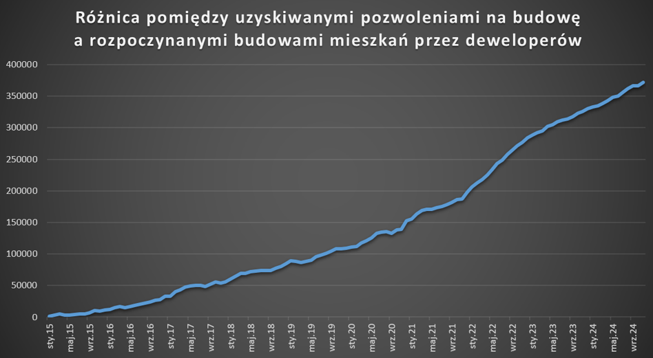Tylko w ciągu pierwszych jedenastu miesięcy 2024 r. różnica między liczbą uzyskanych pozwoleń a rozpoczętych budów przekroczyła 41 tys. Patrząc na wyniki notowane w ostatnich miesiącach poprzednich lat, wiele wskazuje na to, że zakończony niedawno rok będzie pod tym względem drugim w historii.