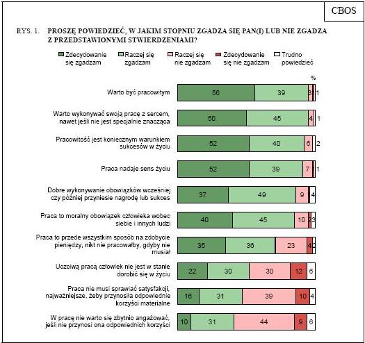 Polacy znacznie częściej stoją na stanowisku, że praca to sens życia. Uważają, że zawsze należy wykonywać swoją pracę jak najlepiej się potrafi bo jest to moralny obowiązek wobec siebie i innych w społeczeństwie. Z kolei mniejsza część uważa, że praca nie musi sprawiać satysfakcji, najważniejsze, żeby przynosiła odpowiednie korzyści materialne, a jeśli ich nie przynosi, to nie warto się w nią angażować.