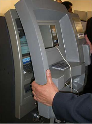Najczęściej jednak przeróbka nie jest aż tak wyrafinowana. Wystarczy, że skimmerowi zamontowanemu w miejscu na wprowadzenie karty towarzyszy kamera, wycelowana w klawiaturę, która nagrywa kody wpisywane przez klientów. Kamera może być umieszczona w listwie nad ekranem lub w dodatkowym elemencie przyczepionym przez oszustów do bankomatu.