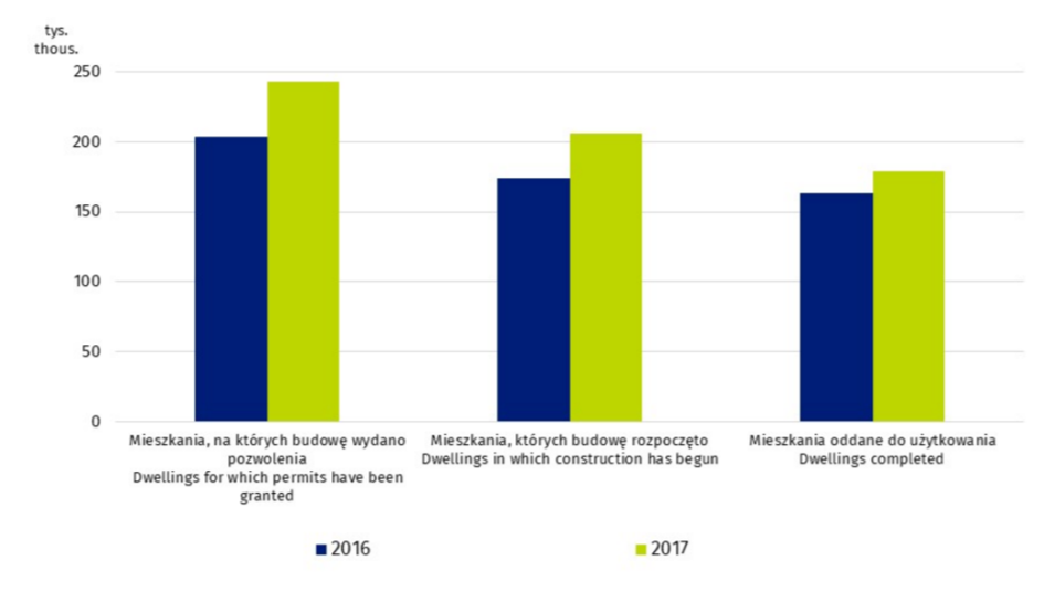 Dwucyfrowe wzrosty odnotowano w liczbie rozpoczętych budów – w 2017 r. wystartowały inwestycje obejmujące 205,9 tys. mieszkań. Wynik z 2016 r. został poprawiony aż o 18,4 proc., a wskaźnik ten wzrósł we wszystkich segmentach rynku z wyjątkiem budownictwa komunalnego. Wzrosty odnotowano we wszystkich województwach, a najwięcej nowych lokali powstaje w mazowieckim oraz wielkopolskim.