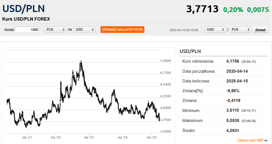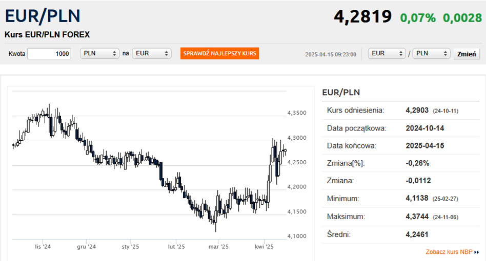 Za sprawą rynkowych perturbacji będących efektem wojen celnych prezydenta Trumpa oraz zapowiedzianych przez szefa NBP gwałtownych obniżek stóp procentowych w Polsce złoty zdecydowanie osłabł się względem euro. Para euro-złoty wybiła się górą z marcowej konsolidacji. W efekcie przedział 4,15-4,20 zł został zastąpiony pasmem 4,20-4,30 zł. Analitycy ostrzegają, że w negatywnym scenariuszu kurs euro może przetestować linię 4,38 zł stanowiącą opór, na którym zatrzymywały się lokalne korekty wzrostowe w roku 2024.